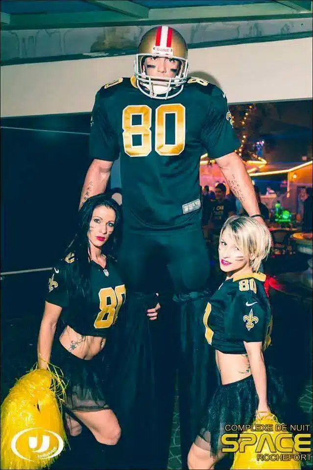 2.) Passage échasse en footballeur américain (costume épaulières, casque, maillot … )